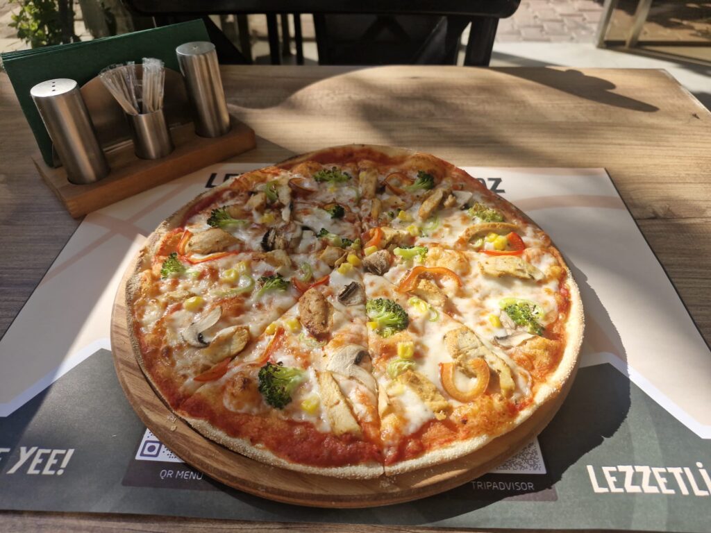 Tavuklu Pizza Domates Sosu, Mozzarella, Tavuk, Brokoli, Mantar, Mısır, Kırmızı Biber, Yeşil Biber Fiyat:260 TL / 320 TL / 380 TL